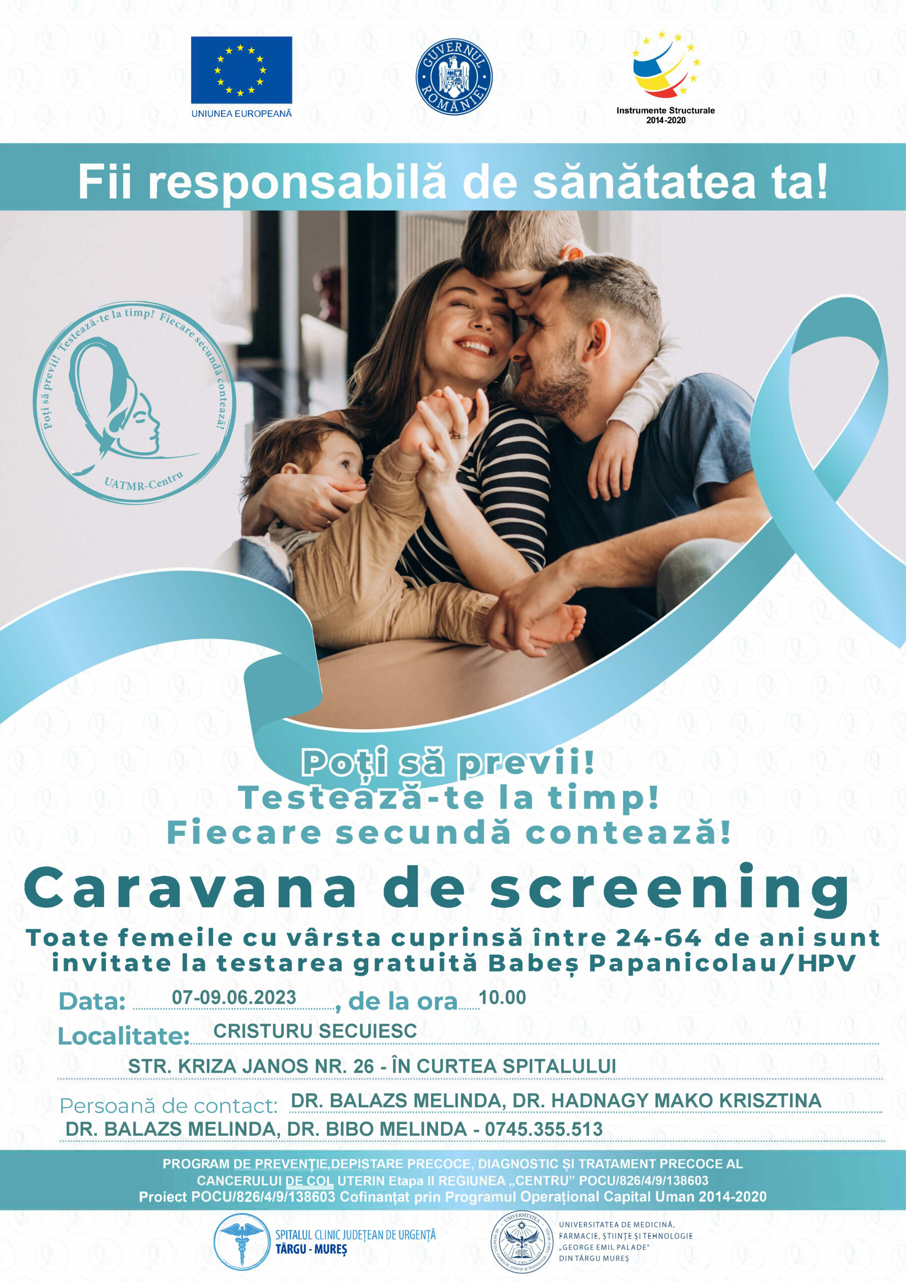 Caravana mobilă pentru screeningul cancerului de col uterin va fi prezentă în perioada 07-09.06.2023, începând cu ora 10.00, în localitatea Cristuru Secuiesc, judeţul Harghita.