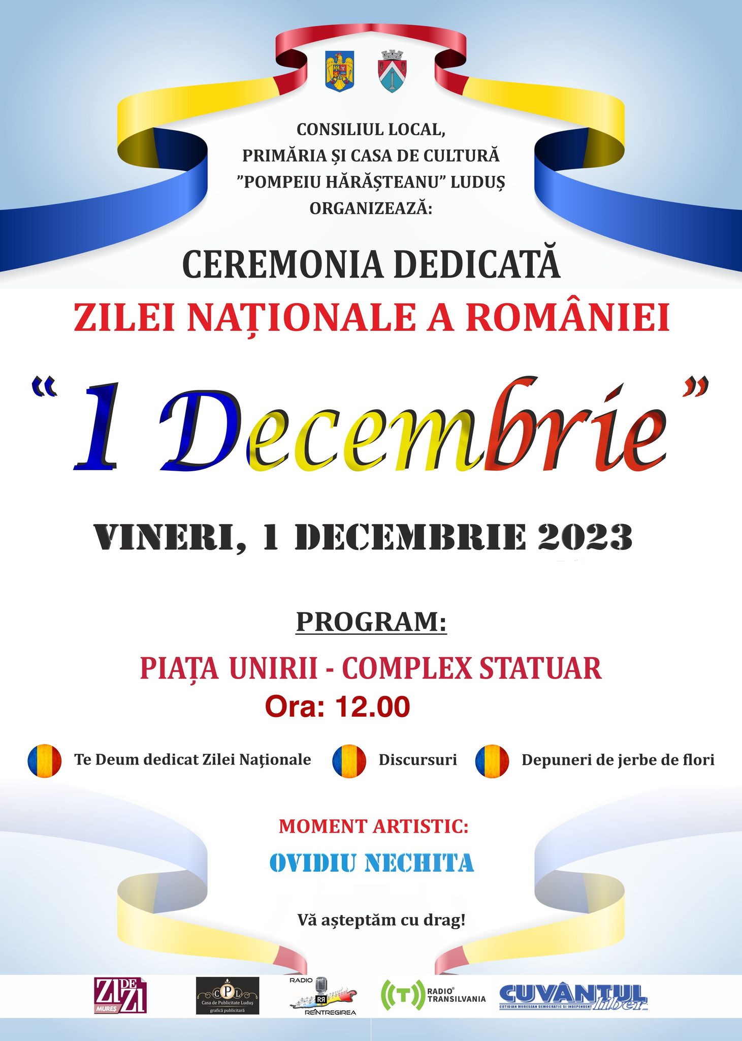 Primăria orașului Luduș a pregătit o serie de manifestări, prin care să celebreze Ziua Națională a României, in data de 1 decembrie 2023.