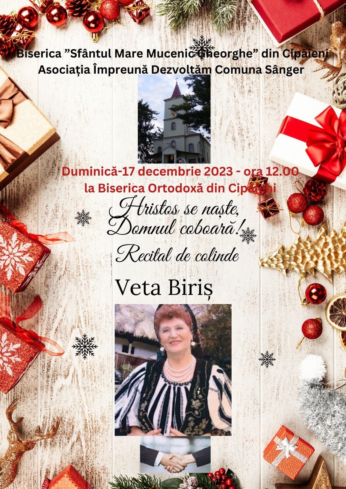 Biserica „Sf. Mare Mucenic Gheorghe” din Cipăieni, în parteneriat cu Asociația Împreună Dezvoltăm comuna Sânger organizează duminică, 17 decembrie, de la orele 12:00, cel mai frumos recital de muzică populară și colinde din istoria comunei.