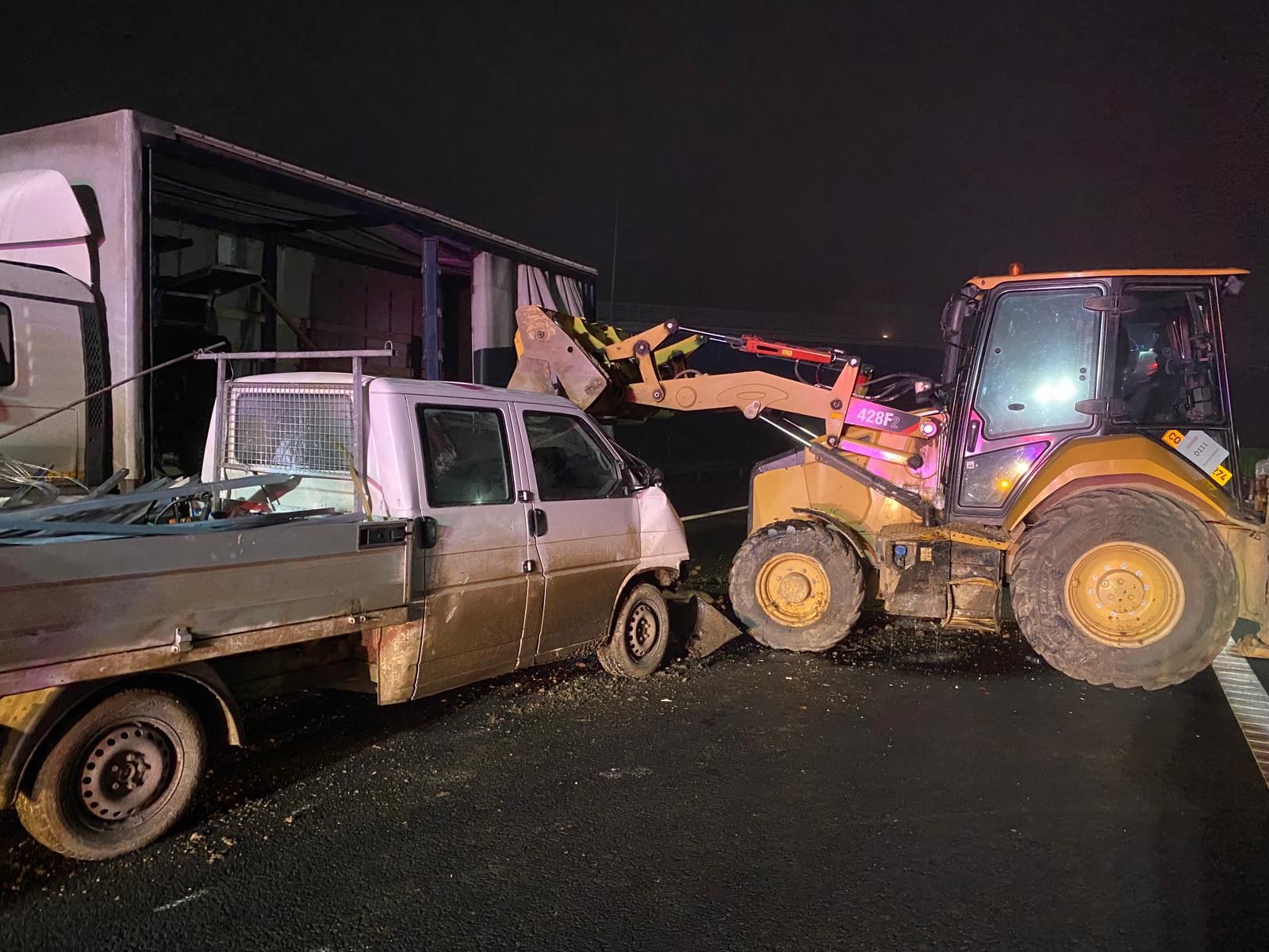 Potrivit primelor informații, o autoutilitară s-a izbit violent de un buldoexcavator care încărca marfă în remorca unui camion.