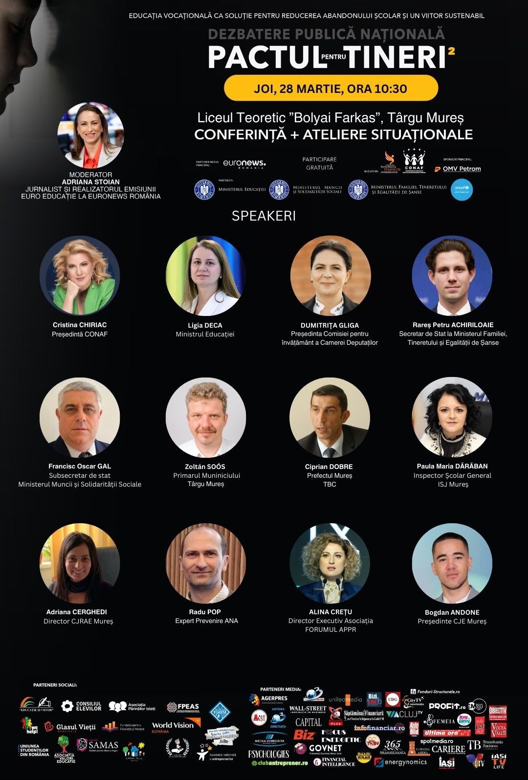 Confederația Națională pentru Antreprenoriat Feminin (CONAF) organizează joi, 28 martie 2024, la Liceul Teoretic “Bolyai Farkas” din Târgu Mureș, începând cu ora 10:30, dezbaterea publică din cadrul programului național pentru reducerea abandonului școlar „Pactul Pentru Tineri”, în parteneriat cu Ministerul Educației, Ministerul Familiei, Tineretului și Egalității de Șanse, Ministerul Muncii și Solidarității Sociale și UNICEF, cu susținerea sponsorului principal OMV Petrom și a partenerului media principal Euronews România.