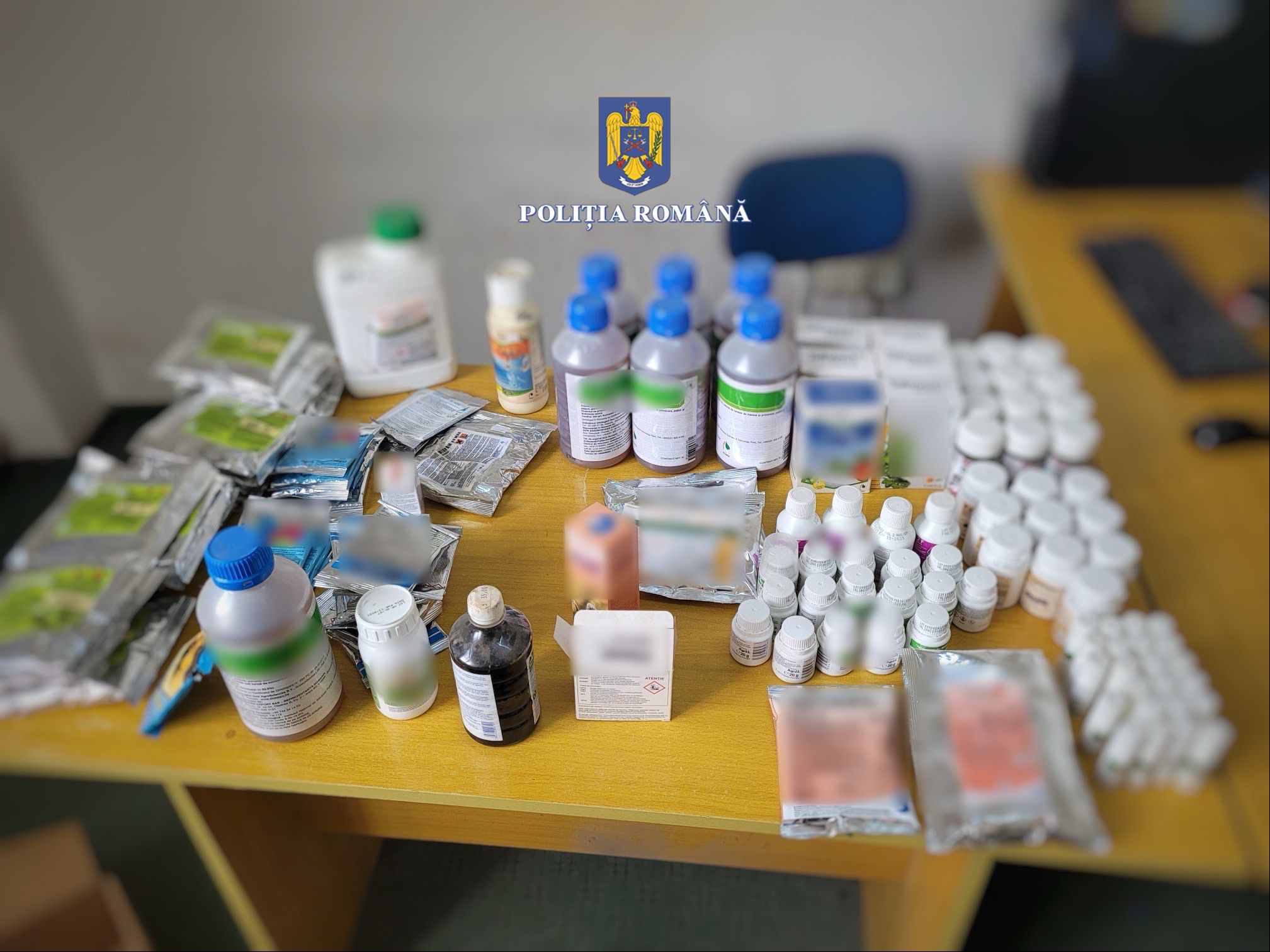 Au mai fost ridicate în vederea confiscării 76 de flacoane, 47 de fiole și 52 de plicuri cu fungicide, insecticide și erbicide.