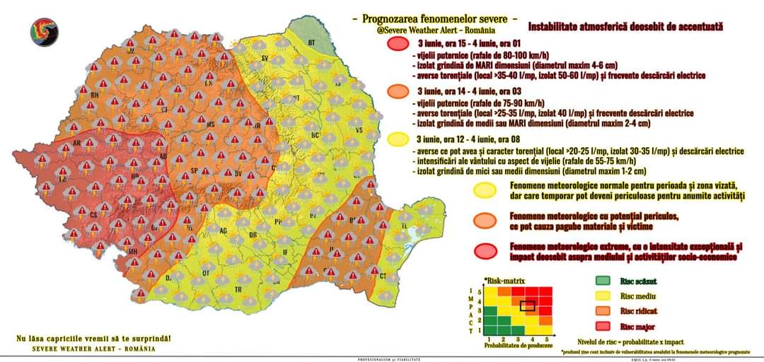 ℹ️ Notă: în a doua parte a zilei de mâine, 4 iunie, instabilitatea atmosferică va fi deosebit de accentuată în nordul, centrul, estul și sud-estul țării.