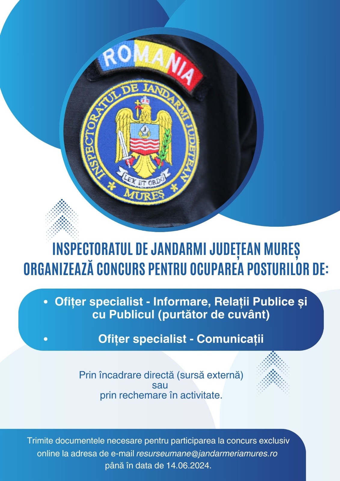 Vă reamintim că Inspectoratul de Jandarmi Județean Mureș organizează concurs pentru ocuparea posturilor de Ofițer specialist – Informare, relații publice și cu publicul (purtător de cuvânt) respectiv Ofițer specialist – Comunicații, prin rechemare în activitate sau încadrare directă (sursă externă).