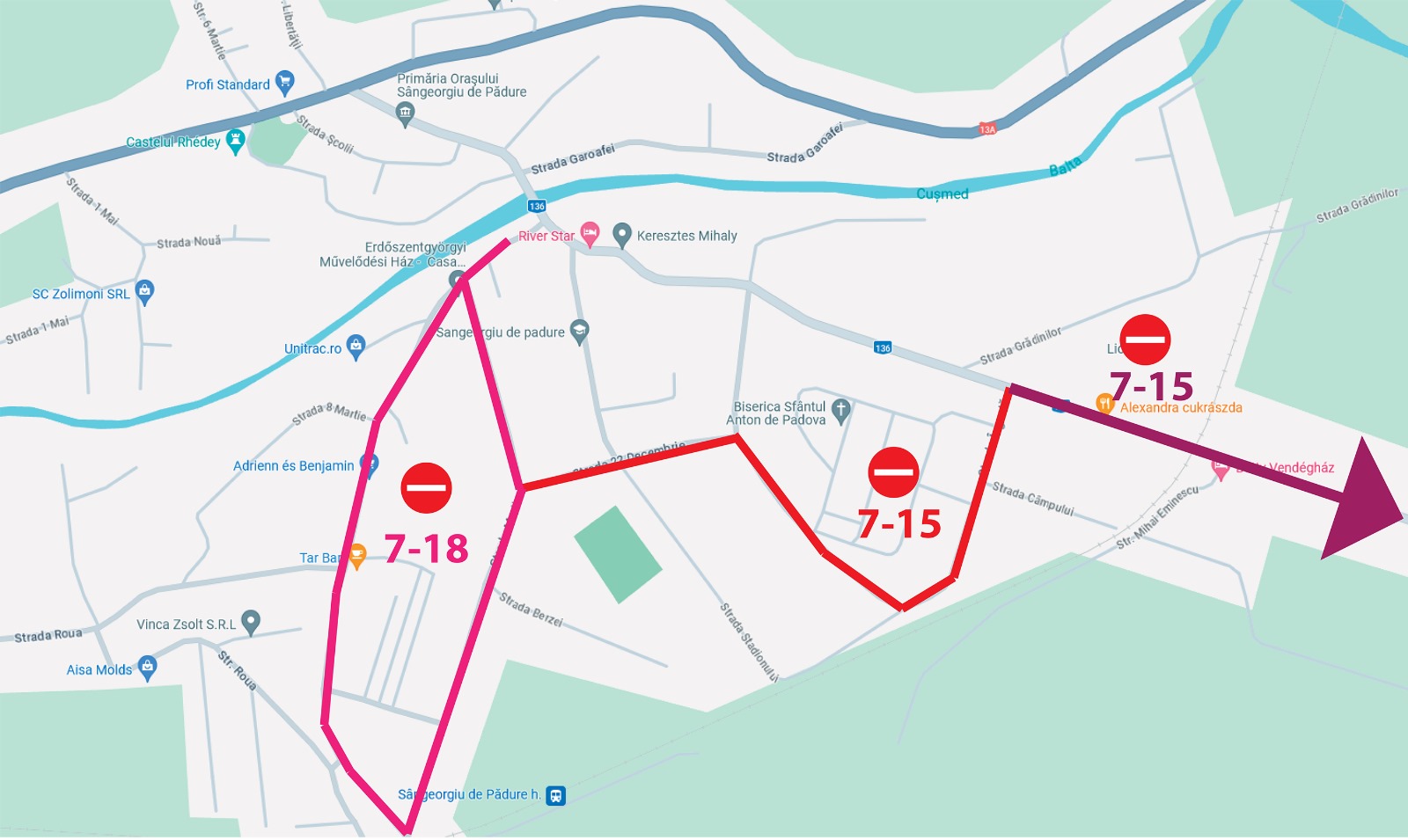 și pietonal. - Între orele 7:00 și 15:00, un segment al străzii Petőfi din Sângeorgiu de