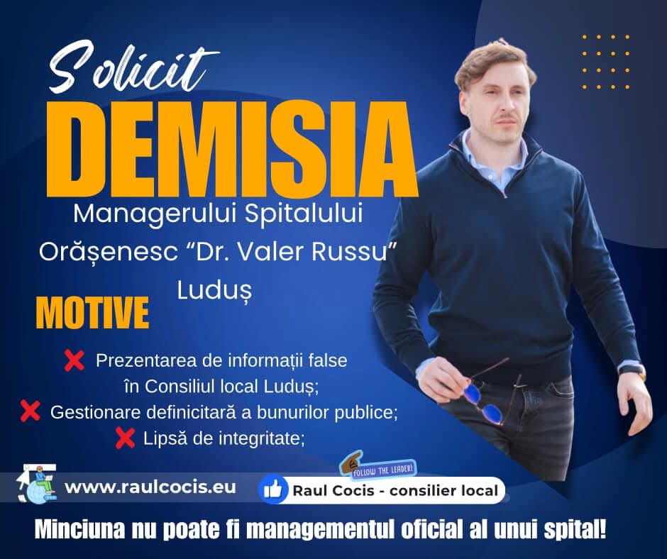 Raul Cociș, consilier local din partea PNL Luduș, a lansat un mesaj ferm pe rețelele sociale, solicitând demisia de urgență a managerului Spitalului Orășenesc „Dr. Valer Russu”. Consilierul acuză lipsa de transparență și contradicțiile din declarațiile oficiale ale managerului, considerând că aceste aspecte afectează grav credibilitatea instituției.