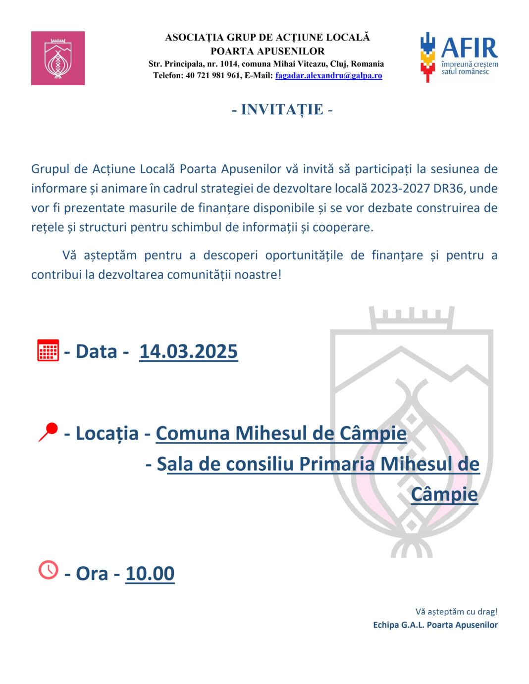 Echipa G.A.L. Poarta Apusenilor își exprimă dorința de a sprijini dezvoltarea durabilă a zonei și invită locuitorii comunei Mihesul de Câmpie la acest eveniment de informare și consultare.