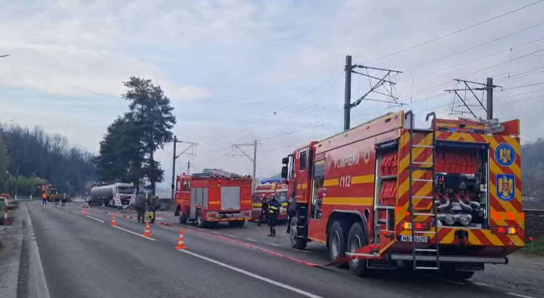 Traficul a fost oprit pentru a permite intervenția pompierilor care se vor ocupa de curățarea carosabilului.