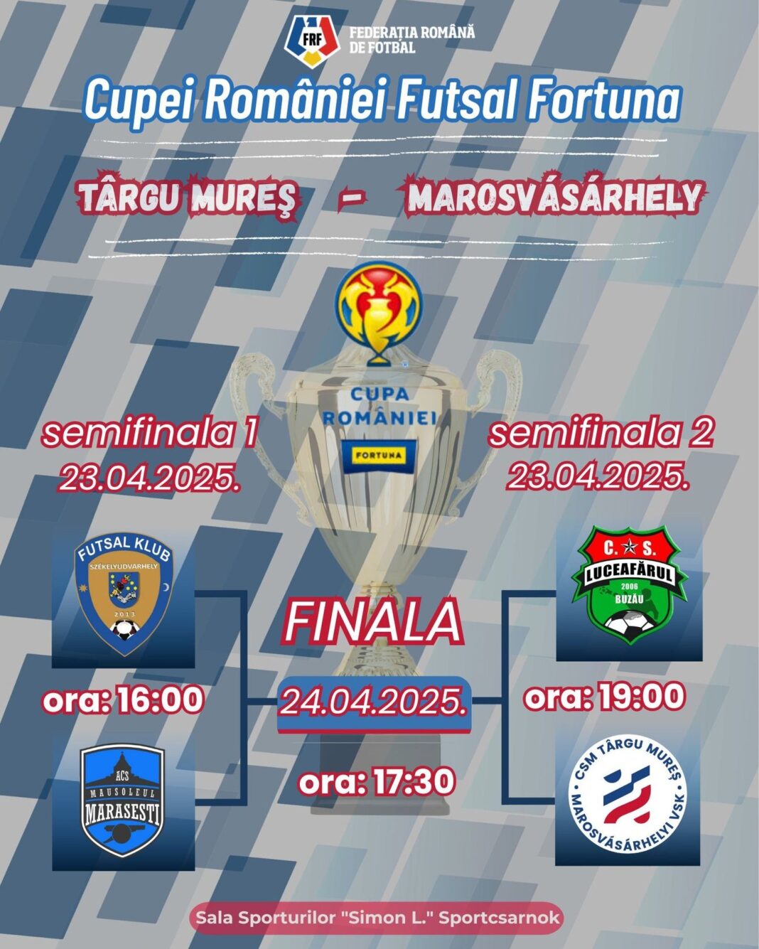 Târgu Mureș devine, în aceste zile, capitala futsalului românesc, găzduind semifinalele și finala Cupei României Futsal Fortuna. Patru formații de top, patru stiluri de joc, un singur trofeu – spectacolul este garantat în Sala Sporturilor „Simon Lajos”.