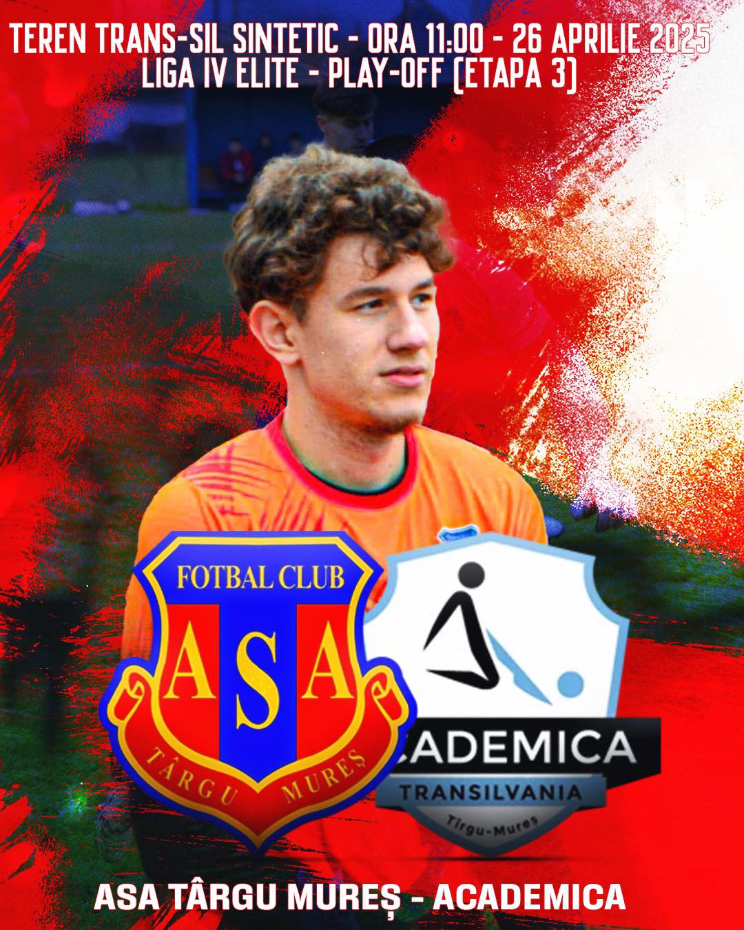Târgu Mureș – Etapa a 3-a din play-off-ul Ligii a IV-a Elite aduce pe terenul sintetic Trans-Sil o confruntare cu miză: ASA Târgu Mureș vs. Academica Transilvania, meci ce va avea loc sâmbătă, 26 aprilie 2025, de la ora 11:00. „Roș-albaștrii” nu mai joacă doar pentru victorie – joacă pentru demnitate, spirit și promovare reală.