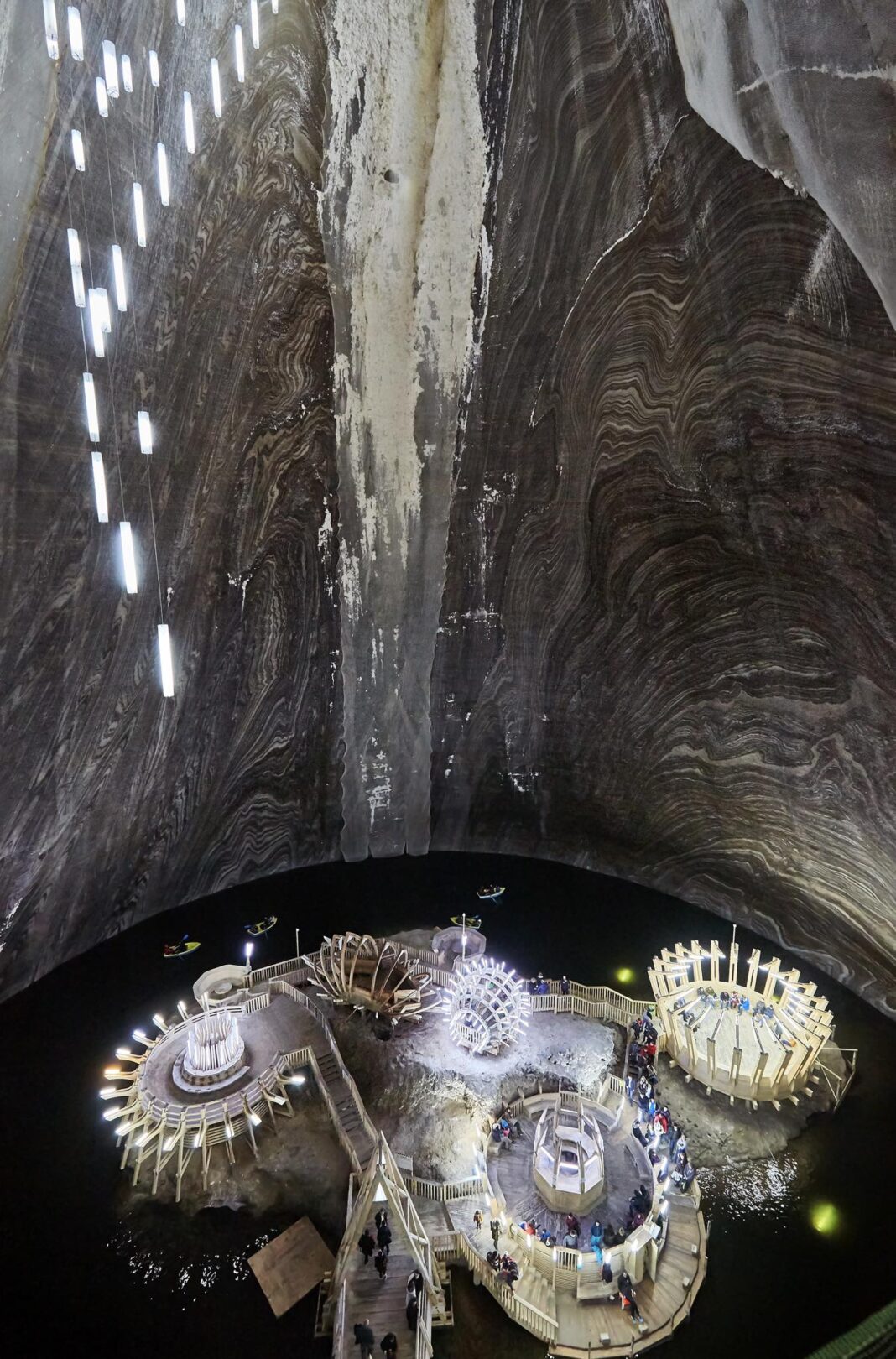 Ceea ce face Salina Turda cu adevărat specială este arhitectura sa naturală impresionantă, combinată cu amenajări futuriste și elegante. Camerele subterane par desprinse dintr-un film SF – pereți de sare strălucind în lumina reflectoarelor, structuri de lemn cu forme rotunde, platforme suspendate și instalații artistice care pun în valoare frumusețea brută a sării.