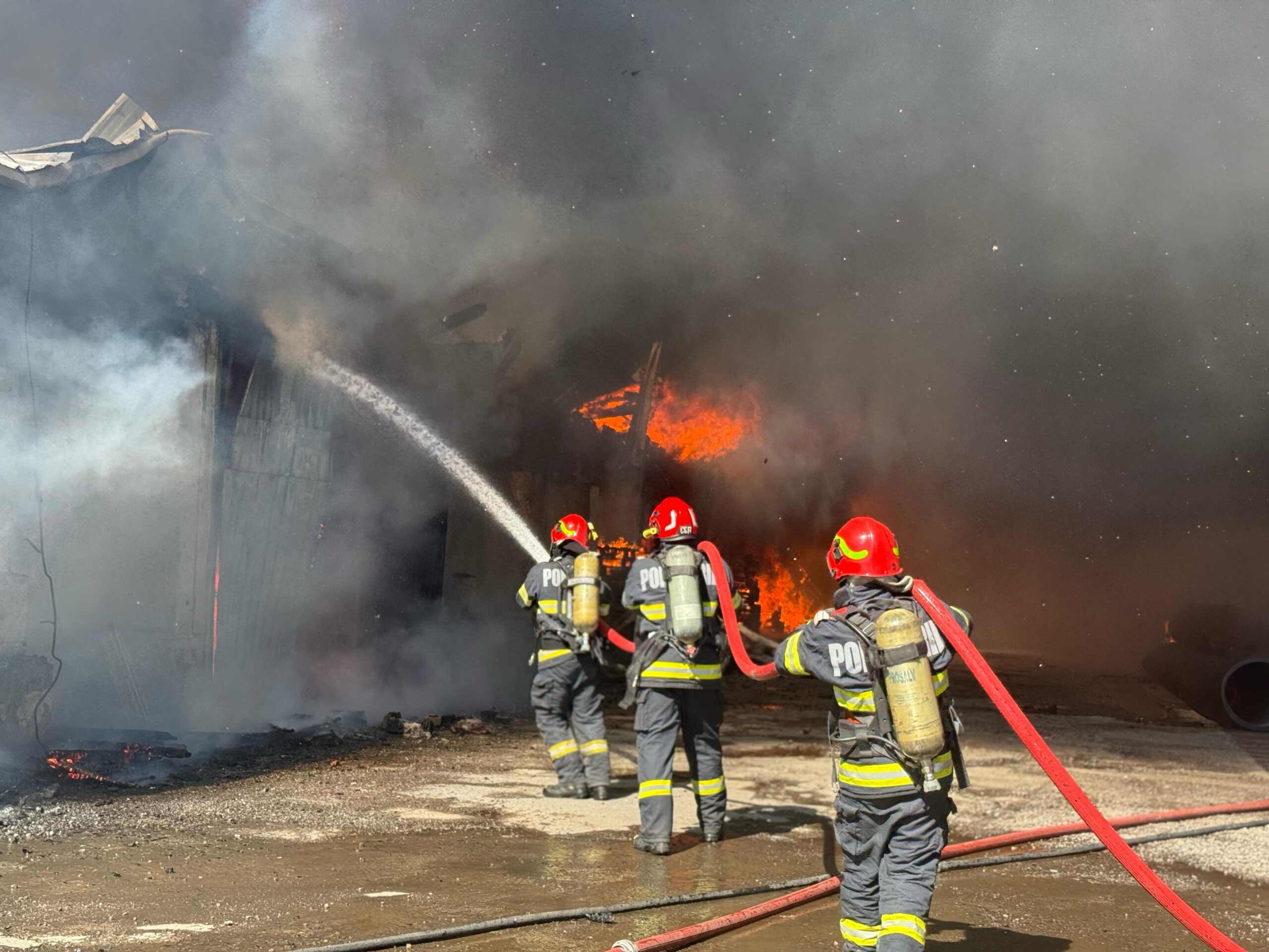Flăcările se manifestă pe o suprafață de aproximativ 600-700 de metri pătrați, cu degajări mari de fum.