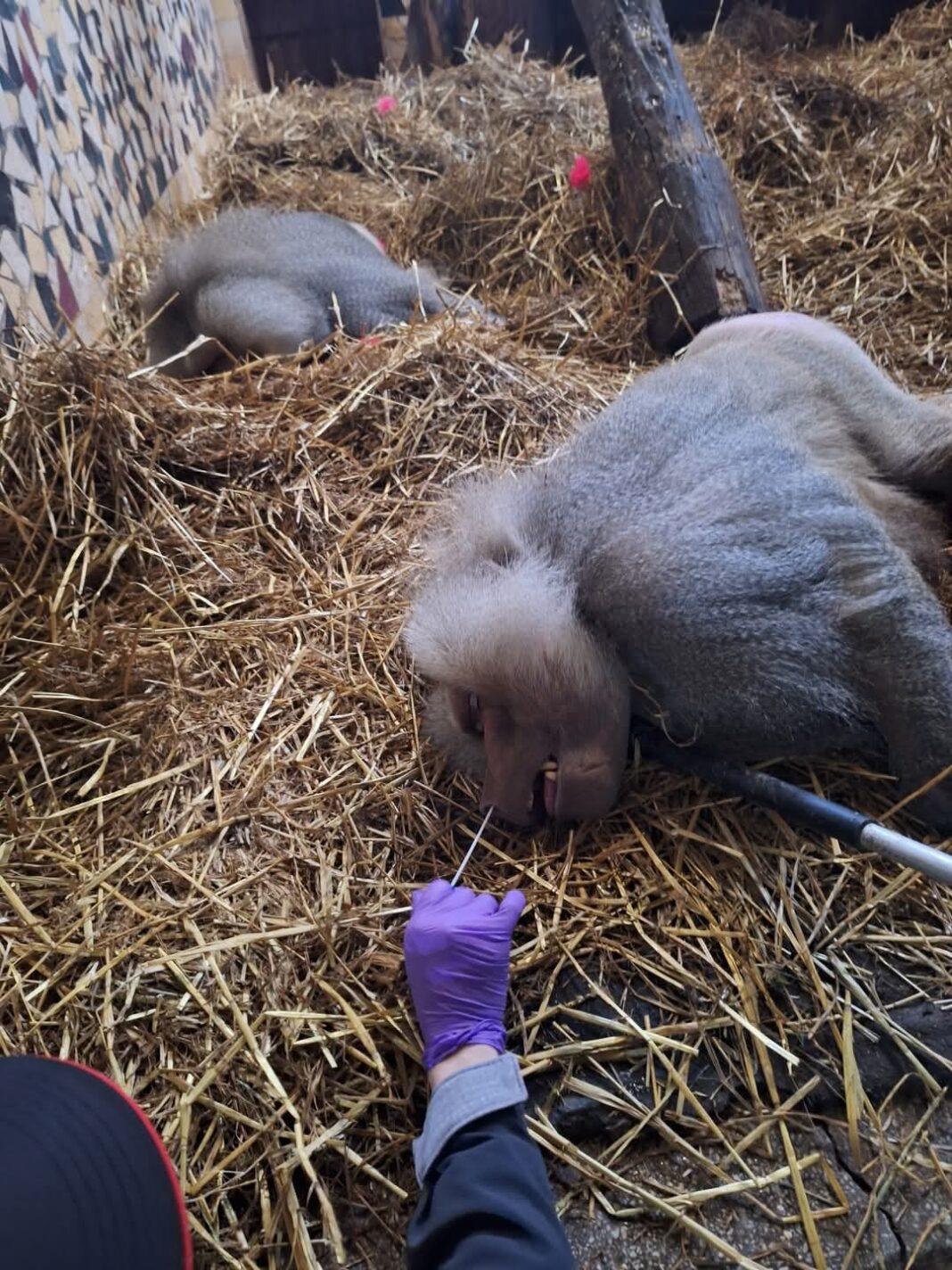 Din cauza unor tratamente necesare, unul dintre pavianii noștri cu mantie a fost supus unei proceduri sub anestezie, pentru ca intervențiile să poată fi efectuate în siguranță și fără stres. Cu această ocazie specialiștii de la Universitatea de Științe Agricole și Medicină Veterinară, Facultatea de Medicină Veterinară din Cluj-Napoca au prelevat mostre de salivă, gât și fecale, iar ca parte a unei cercetări științifice, au examinat și dinții animalului.