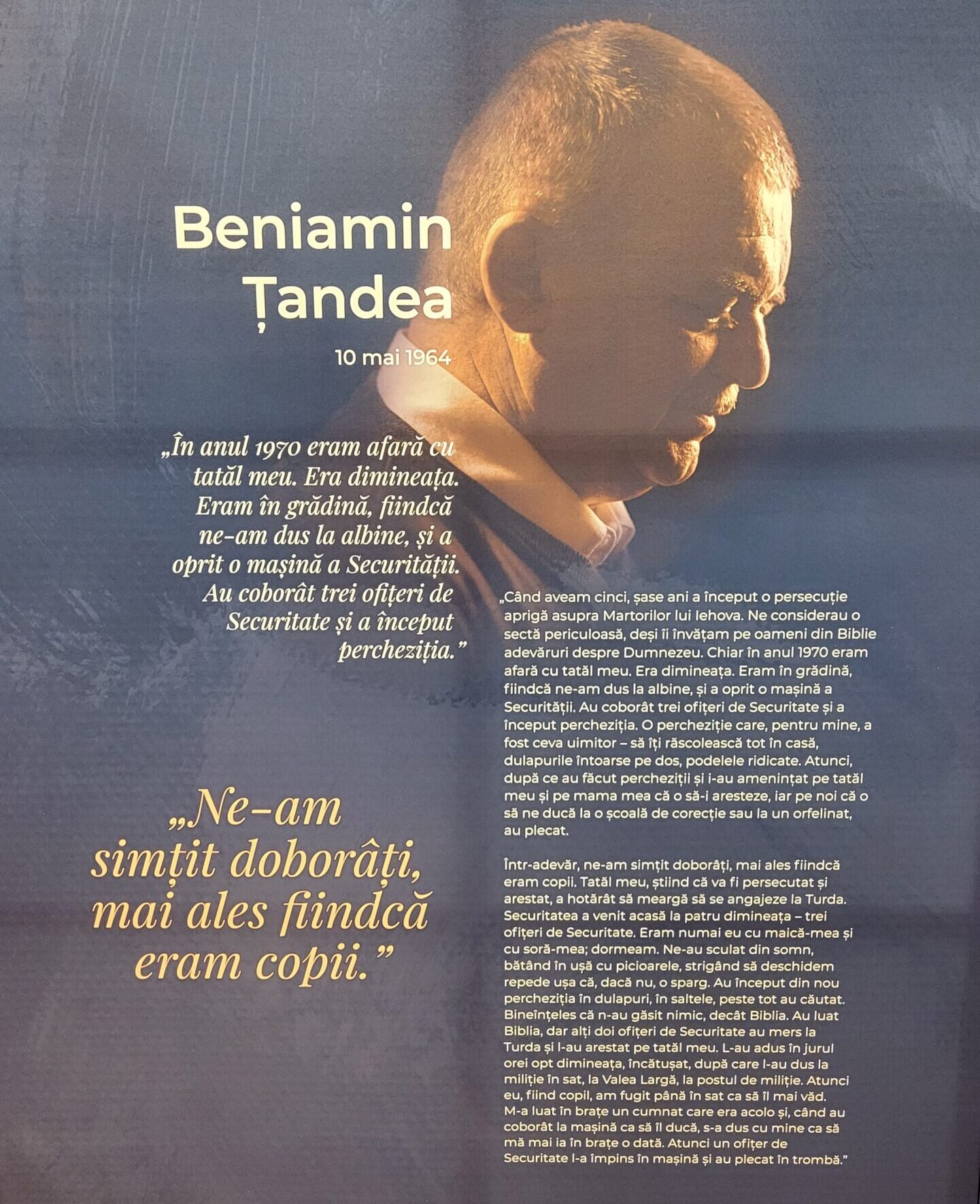 Într-o Românie în care libertatea religioasă era un vis îndepărtat, copilăria lui Beniamin Țandea a fost marcată de teroare și umilință. Povestea sa, relatată într-un panou expozițional emoționant, scoate la lumină una dintre cele mai negre perioade ale regimului comunist: persecuția sistematică asupra Martorilor lui Iehova.