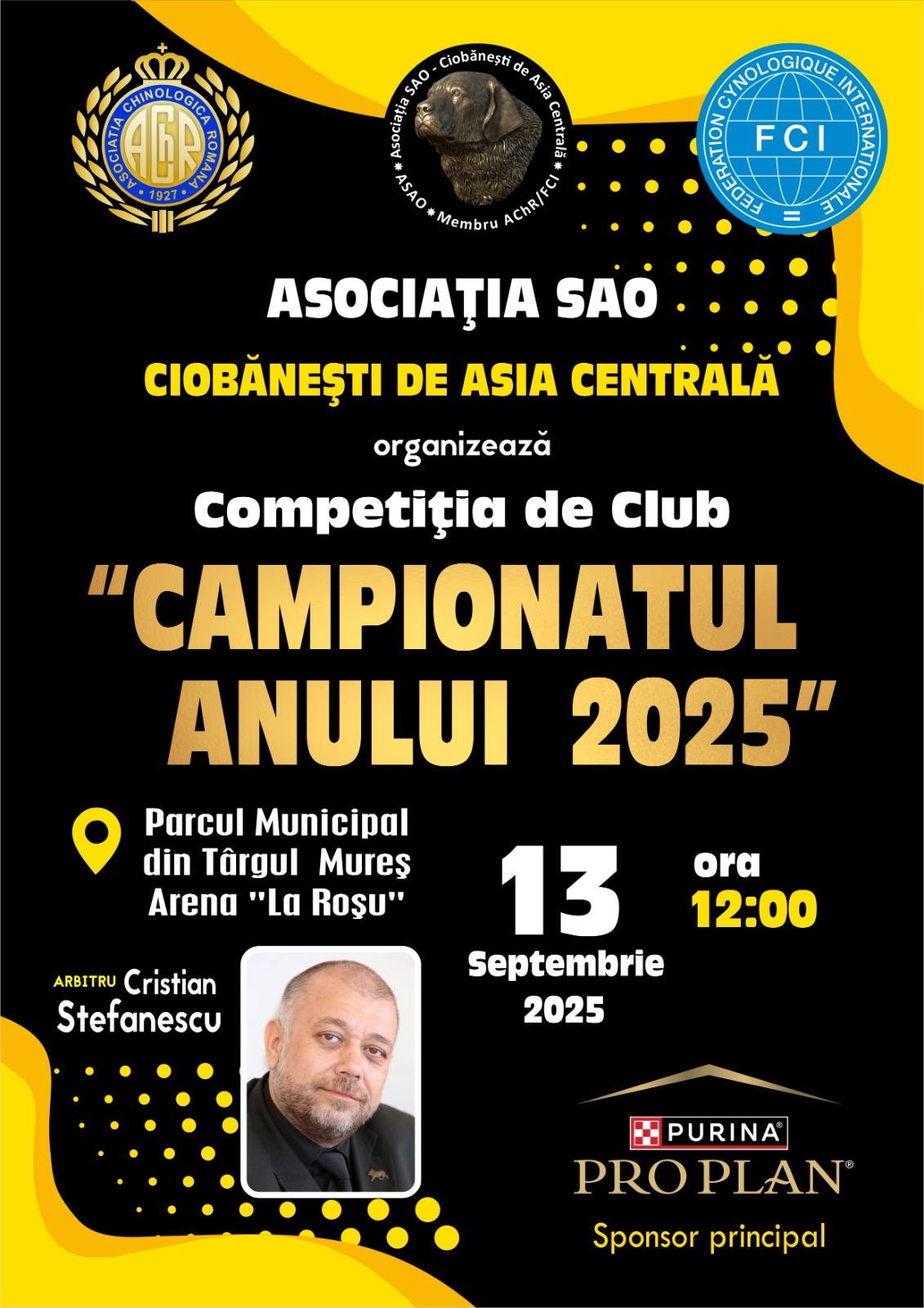 Pe 13 septembrie 2025, Parcul Municipal din Târgu Mureș va găzdui una dintre cele mai așteptate competiții cinologice ale anului: „Campionatul Anului 2025”, dedicat Ciobăneștilor de Asia Centrală, organizat de Asociația SAO, membră AChR/FCI.