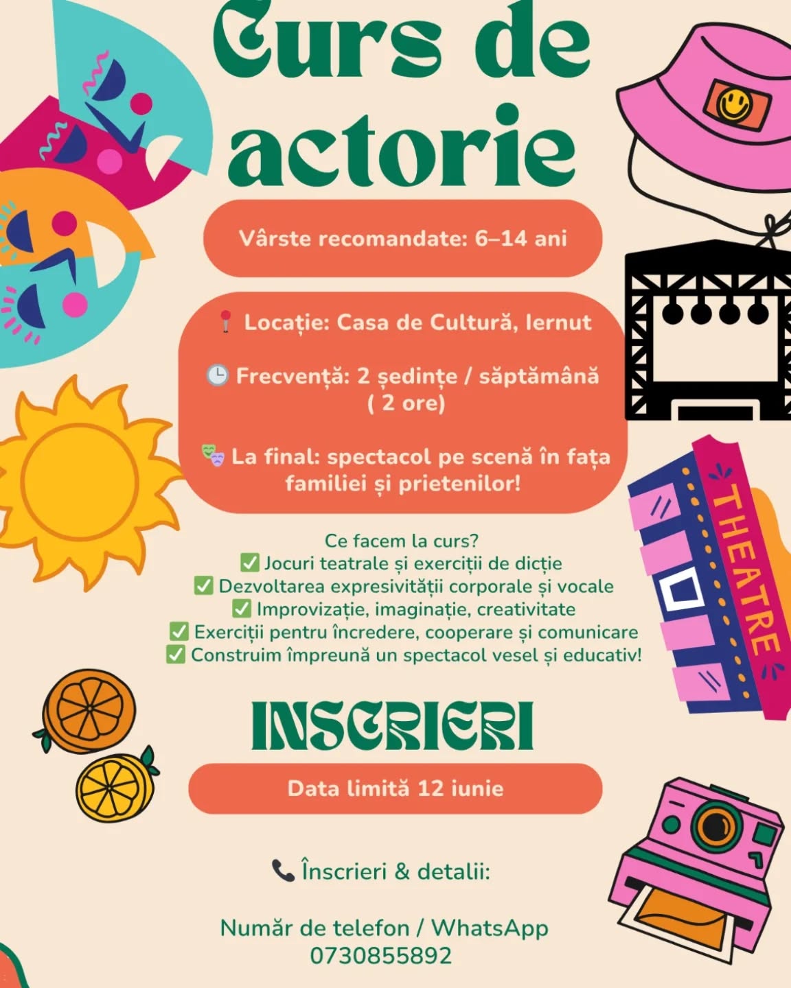 Vara aceasta, creativitatea, joaca și emoția urcă pe scenă la Casa de Cultură din Iernut, unde copiii cu vârste între 6 și 14 ani sunt invitați să descopere magia teatrului în cadrul unui Curs de Actorie inedit și captivant!