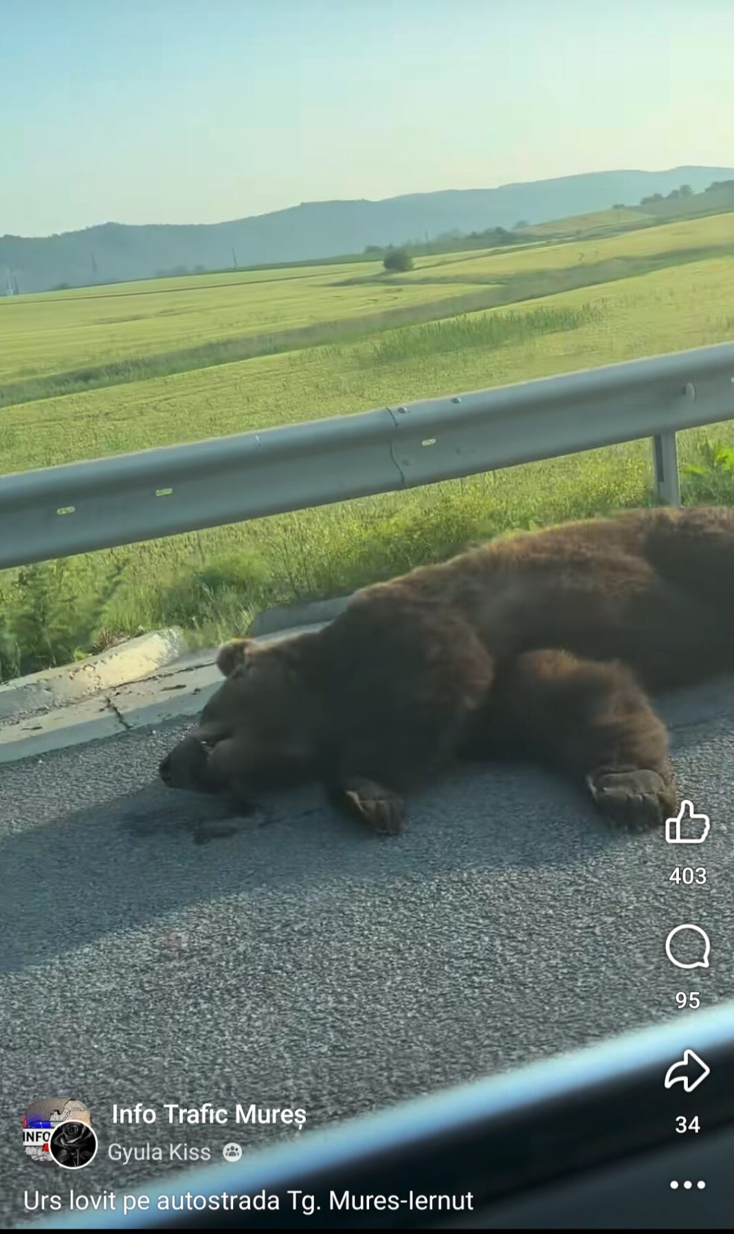 Un incident grav s-a petrecut azi-noapte pe autostrada A3, în sectorul Târgu Mureș – Iernut: un urs a fost lovit mortal de un autovehicul. Animalul zăcea fără viață pe marginea carosabilului, în apropierea parapetului de protecție, imaginea fiind surprinsă în această dimineață de un participant la trafic și publicată pe grupul „Info Trafic Mureș”.