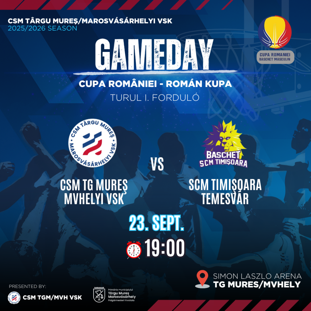 Zi mare pentru iubitorii baschetului din Târgu Mureș! Astăzi, marți, 23 septembrie, Sala Simon László Arena găzduiește primul tur al Cupei României – Baschet Masculin, unde echipa locală CSM Târgu Mureș/Marosvásárhelyi VSK întâlnește puternica formație SCM Timișoara.