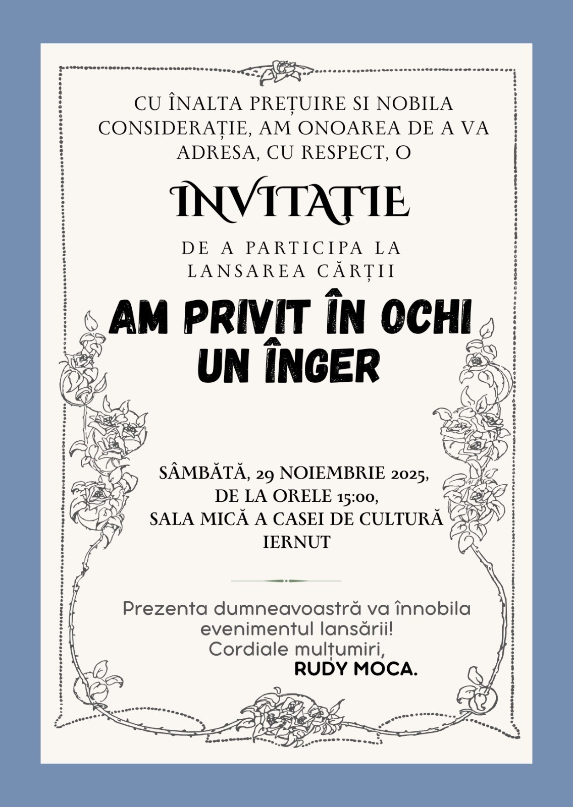 Comunitatea din Iernut este invitată sâmbătă, 29 noiembrie 2025, de la ora 15:00, în sala mică a Casei de Cultură, la un eveniment literar cu totul special: lansarea volumului „Am privit în ochi un înger”, semnat de Rudy Moca.